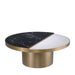Die außergewöhnliche Tischplatte besteht aus zwei halbrunden Marmorplatten. Im Vergleich zum weißen Marmorteil ist der schwarze Marmorteil größer und leicht erhöht. Der Sockel und der Rand dieses auffälligen Beistelltischs sind mit gebürstetem Messing veredelt.